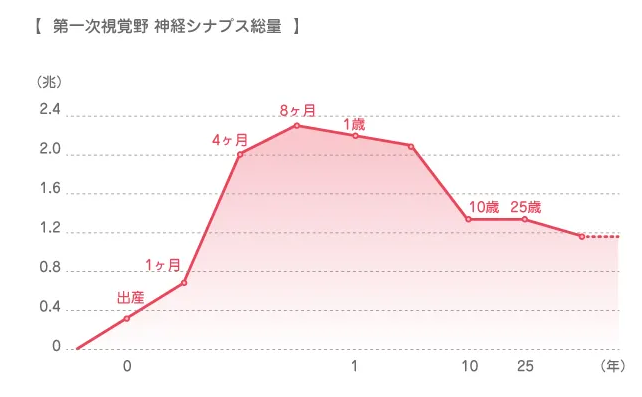 第一次視覚野神経シナプスは、生後3ヶ月までに急激に増加し、8ヶ月で発達の頂点に至ります。それ以降、成長の経過とともに下降していきます。